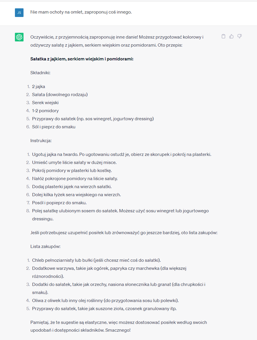No dobrze, a co w sytuacji kiedy nie mam ochoty na omlet? Spróbujmy poprosić sztuczną inteligencję o zaproponowanie czegoś innego: